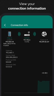 - Shows information about the wifi connection (external IP, signal strength, download and upload speed, subnet mask, gateway, DNS).