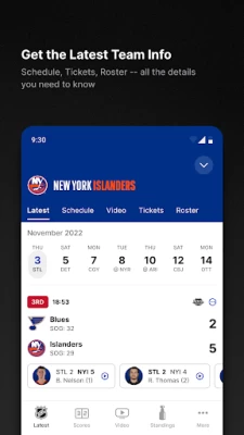 • Stay up to date with every team’s scores, schedules, standings, videos, and rosters
