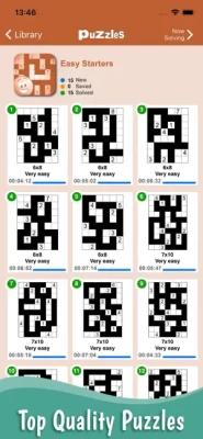 To help see the puzzle progress, graphic previews in the puzzle list show the progress of all puzzles in a volume as they are being solved. A Gallery view option provides these previews in a larger format.