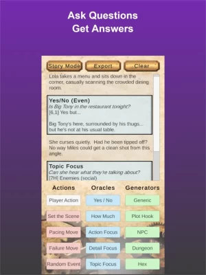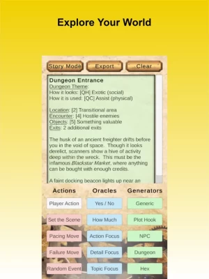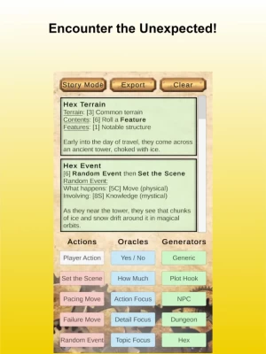 As you play, you may need to generate some quests to pursue, NPCs to meet, or dungeons to explore. Use the Generator actions to make new content whenever you need it. The Generic Generator is especially useful since it can give you ideas for magic items, space ships, evil organizations, and just about anything else you can think of.