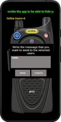 The app has public channels and users set on a same channel can talk with holding the PTT button.