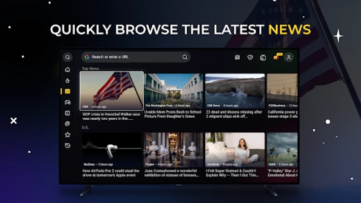Open - AdBlock android TV Web Browser for smart tv, websites, video, tv shows, anime, movies. Enjoy the Internet: stream movies, series, browse the web, play games, and much more without ads. It's a convenient, secure, multi-functional browser for tv. Simple to use, ads blocking and quick access to your favorite sites. Search for anything safely and be sure of the result. It includes features such as bookmarks, browsing history, search engines shortcut, and cookies blockers. Search for anything safely and be sure of the result. Use incognito mode for more anonymity.