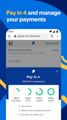 • Payments are easy to manage in the app. Pay in 4 is available upon approval for purchases of $30 - $1500 and is currently not available to residents of MO or NV. 18 years old or older to apply. PayPal, Inc.: Loans to CA residents are made or arranged pursuant to a CA Financing Law License. GA Installment Lender Licensee, NMLS #910457. RI Small Loan Lender Licensee. NM residents: Go to paypal.com/us/webapps/mpp/campaigns/newmexicodisclosure. Learn more atpaypal.com/payin4