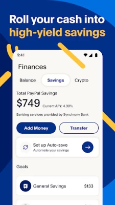 *As of June 07, 2023, the annual percentage yield (APY) for PayPal Savings is 4.30%. This is a variable rate and can change at any time, including after the account is opened. National average source: FDIC National Rates and Rate Caps as of February 20, 2024. https://www.fdic.gov/resources/bankers/national-rates/#one PayPal is a financial technology company, not a bank. Banking service provided by Synchrony Bank, Member FDIC. PayPal Balance account is required to use PayPal Savings.