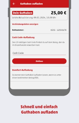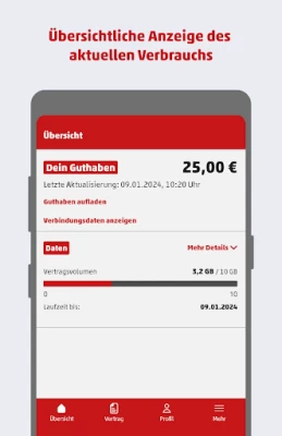 • Anzeige des aktuellen Prepaid-Guthabens • Anzeige des aktuellen Datenverbrauchs • Prepaid-Guthaben aufladen (per Cash Code oder automatisch) • Tarifwechsel durchführen • Optionen buchen, wechseln und kündigen • Kundendaten einsehen und ändern • Legitimations-PIN einsehen und ändern