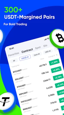 2. Derivatives (Perpetual Contract) trading with up to 100x leverage and settled in USDT, USD, BTC, or ETH.