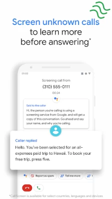 Call Screen answers unknown callers, filters out detected spammers without interrupting you, and helps you learn more about callers you don’t recognize before you pick up.