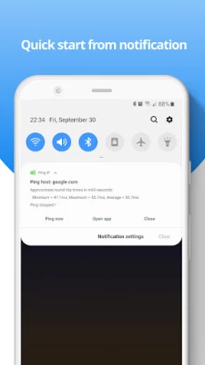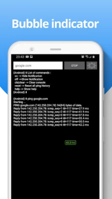 Main features : - Ping any domain or ip address using ICMP protocol - Analyze your internet connection Other features: - Results are displayed like in windows PC - Request timed out handled - Quick start from notification (if you want to hide notification, type 'off' then press enter or touch ping button) - Easy to use (without any setup)