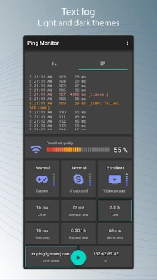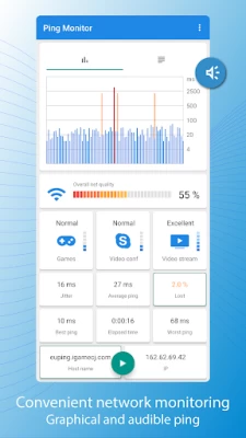 Pingmon (Ping test monitor) is a graphical tool for measuring and monitoring the quality of the Internet or local networks, Wi-Fi and 3G/LTE. This latency monitoring visualizes and voices the ping command and measures the quality of a service (QoS) based on the statistics collected.
