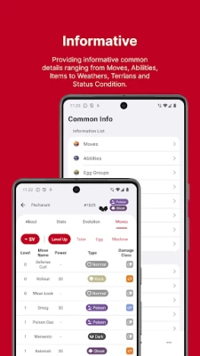 Informative: Providing informative common details ranging from Moves, Abilities, Items to Weathers, Terrians and Status Condition. Functional: Featured with battle related type effectiveness, bind spots and status calculators.