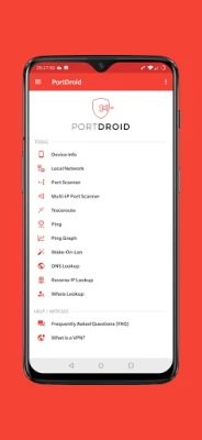 • Port Scanner: Probe any IP for open TCP ports with the added advantage of banner grabbing. Discover web services and let PortDroid suggest external applications for known protocols (ssh, telnet, http, https, ftp, smb etc.).