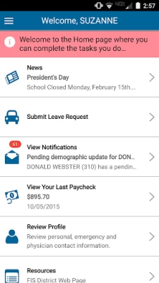 Easy to download and easy to use, the PowerSchool ERP Employee App provides teachers, administrators, and other staff with secure mobile access to their personal employee information, human resource tools, and critical district news. Employees log in to access vital information—right at their fingertips. They can submit requests for leave time or to update their contact information. The Home page displays district announcements, notifications, and the most recent paycheck.