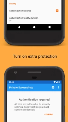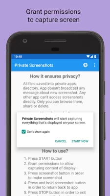 All files are saved into hidden directory. The app doesn't broadcast any message about new screenshot. Any other app can't access screenshots directly. Only you can browse them, share or delete.