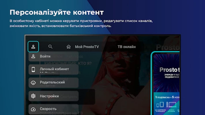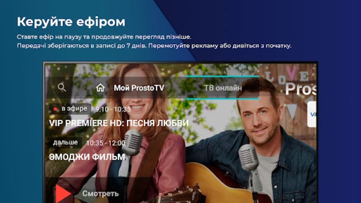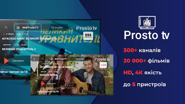 Turn on your favorite TV channels or movies online in the Prosto TV app.