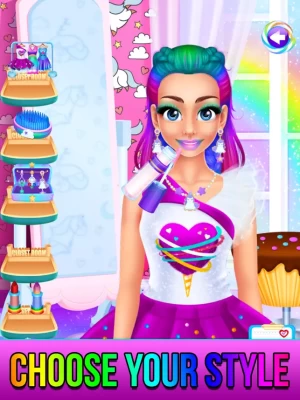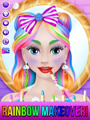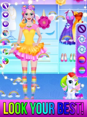 Level 5 : Get a makeover with rainbow unicorn, candy or rainbow princess! Apply make-up, change outfits, brush hair and much more!