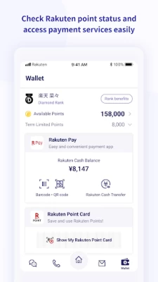 Using Rakuten Link's Wallet, you can send Rakuten Cash to anyone, pay and collect Rakuten Points through Rakuten Point Card, quickly check your Point balances such as "Available Points", "Term limited Points", etc., and conveniently access the Rakuten Pay app!
