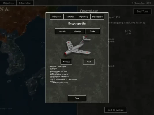 Experience Korean War, Vietnam War, and many other conflicts - both historical and fictional. Command squadrons of more than 450 types of aircraft, from biplanes to multirole fighter jets. Control the seas with more than 160 types of warships including submarines, battleships and aircraft carriers. Leverage new tools like surface-air missiles, air-air refueling tankers, attack helicopters, and missile cruisers to dominate the battlefield.