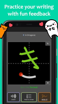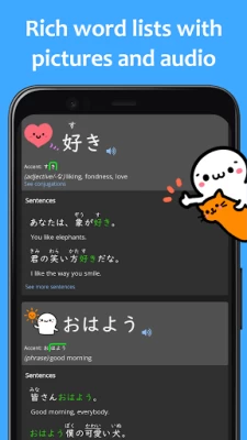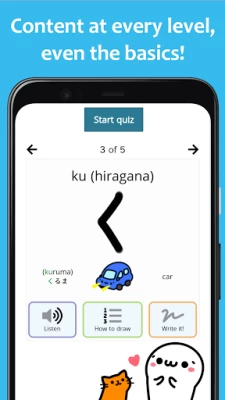 Our mascot Kao-chan is here to let you enjoy learning Japanese, whether it’s through collectible coins every time you quiz, a character that evolves as you learn, manga pages that you unlock, or hundreds of hand-made illustrations.