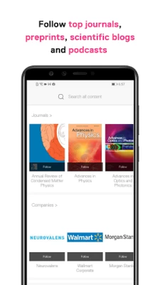 In the app, you can find all the top journals and papers from Springer Nature, Hindawi, ACS , Elsevier, Wiley, Taylor and Francis, RSC, BMJ, IEEE, arXiv, PubMed, PLOS, F1000, Cell, Science AAAS and more.