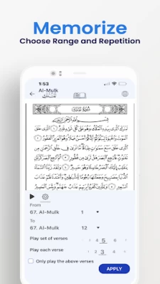 playback of verses to aid in Quranic Memorization. Visuals such as Mushaf Quran Experience including Page number also help with visual memorization.