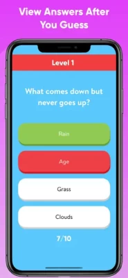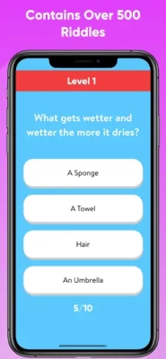 Features: - Hundreds of riddles and brain teasers - Frequently updated with more content - 40 different levels to unlock - View answers after each question - Suitable for all ages kids, teen, and adult as it contains only family friendly questions - Available offline - not internet connection is required to play this game making it the perfect quiz game for road trips