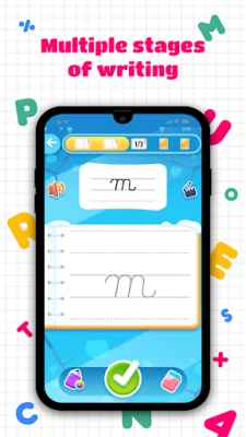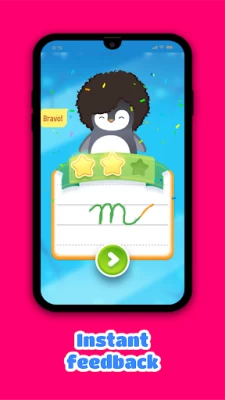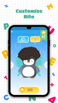 Children are accompanied on their writing learning adventure by the cute penguin Rito. ? Rito is with the children every step of the way with audio encouragement, rewards, and visual suggestions to improve handwriting. The stars earned from completed exercises can be used to personalize the penguin with different costumes and hats. To ensure an authentic learning experience, stars can only be earned after practice, and cannot be purchased. In addition, for each letter learned (small + capital), children are rewarded with a drawing template containing the specific letter. Children can relax by connecting the dots and colouring in the resulting drawing. ?