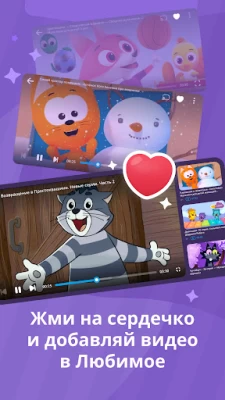 Создайте один или несколько детских профилей и выберите одного из 7 ярких персонажей для каждого. Меняйте фон на любимый цвет малыша, добавьте ласковое имя в название профиля. Отмечайте звёздочкой любимые мультики и мультсериалы, чтобы добавить их «Избранное» и быстро находить в приложении. Функция будет полезна и родителям малышей — отмечайте контент, которые вы рекомендуете или разрешаете смотреть.