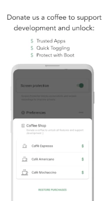 Screen Protector blocks screenshots and blackens screen recordings everywhere on the device. This usage is completely FREE. If you would like to allow screenshots and recordings on some specific apps, you can unlock PREMIUM features by donating us a coffee :). PREMIUM features include: