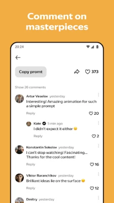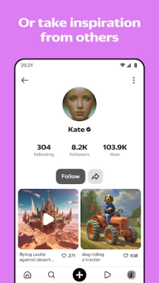 And while the AI is generating your image or text, you can scroll through the feed, comment on other users' posts, and like them. Feed has a few sections: your masterpieces, recent, and the best of the day, the week, or all time. You can save your favorite videos and pictures to your phone.