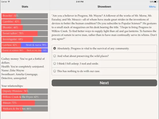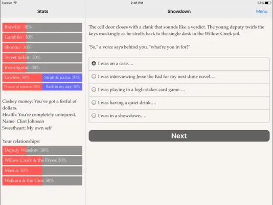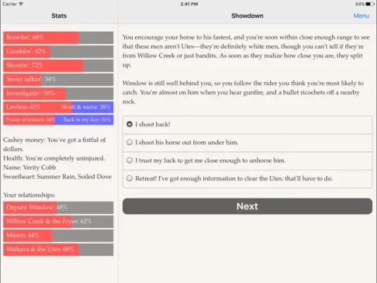 Showdown at Willow Creek is an interactive western mystery novel where your choices control the story. The game is entirely text-based--without graphics or sound effects--but powered by the vast, unstoppable power of your imagination.