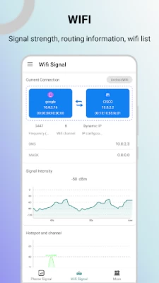 2. WIFI signal: Detect WIFI signal strength in real time, query WIFI information, such as signal strength, mac address, channel, IP configuration, connection rate and other related information, and obtain wifi signal and channel information, wifi security detection, connect under wifi Device Information;