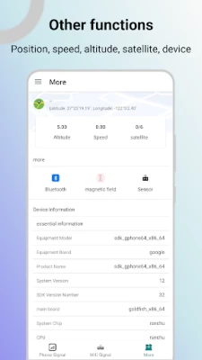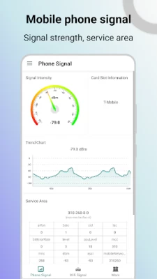 1. Mobile phone signal: detect mobile phone signal strength in real time, query SIM card information, operator and other information, obtain base station location information, query service community information, obtain community signal strength, lac/tac/ci and other community information, browse nearby community information, etc. Signal detection services;