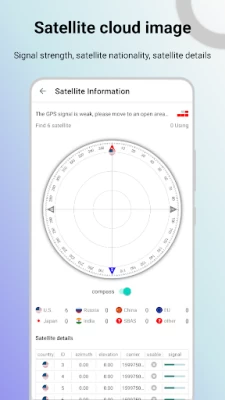 3. GPS signal: detect GPS signal information in real time and obtain satellite information, including nationality name (US GPS, Chinese Beidou, EU Galileo, Russian GLONASS, Japanese Quasi-Zenith Satellite System, Indian IRNSS), number of satellites, real-time satellite Location, availability, latitude and longitude, address and other information;