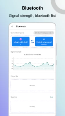 4. Bluetooth signal: Detect Bluetooth signal strength in real time and obtain information such as the currently connected Bluetooth MAC address. Check the paired list, scan to discover more devices and other functions.