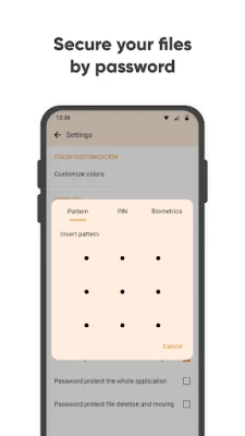 This file organizer is absolutely secure, containing multiple powerful security-related functions, like password-protecting hidden items and deleting or opening the whole app. You can choose between using a pattern, pin, or a biometric lock to keep your data private. The fingerprint permission is needed to lock either hidden item visibility, delete files, or lock the whole app. Simple File Manager works without internet access, further guaranteeing your ultimate privacy.