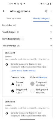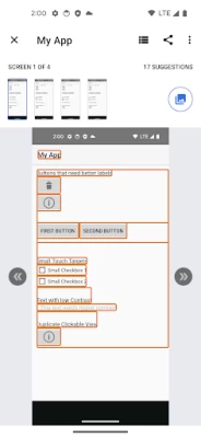"Сканер доступности" – это инструмент, с помощью которого можно получить рекомендации по улучшению доступности интерфейса вашего приложения. Сканер позволяет любому пользователю, не только разработчикам, быстро выявить ряд стандартных возможностей по повышению доступности: это может быть увеличение объектов в области прикосновения, повышение контрастности текста и изображений, а также размещение подсказок для графических элементов без маркировки.