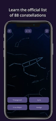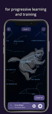 - Three training and testing modes for each level (easy, medium and hard) to help you progress smoothly and guide you to eventually recognize the constellations, stars and DSOs in the real night sky.