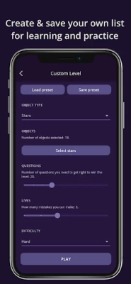 - Create your own list of constellations, stars and DSOs for learning and practice.