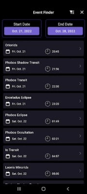 + Events Finder - go to the new Events section to unlock a powerful search engine that finds astronomical events visible tonight and far into the future. The finder dynamically generates a listing of moon phases, eclipses, planetary moon events, meteor showers and planetary phenomenon such as conjunctions, elongations and oppositions.