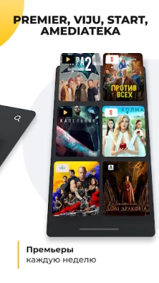 In one app, Smotrеshka offers four streaming services and more than 350 TV channels. Watch PREMIER, START, Amediateka and viju, along with movies, football, cartoons, and series on up to 5 devices, anywhere with Internet access.
