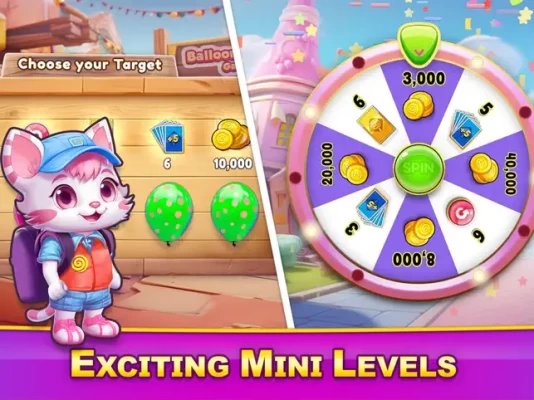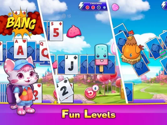 Play levels with a diverse bunch of mechanics to get free coins or play alone and have our crazy characters join you along the way. Not just a standard free Candyworld Solitaire TriPeaks card game, when you can play with Cleo, your encouraging companion. There are other characters too like Peggy, the Bus,Clucky the Chicken .