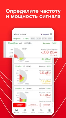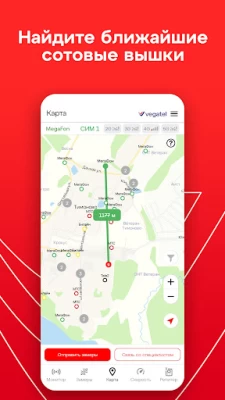 "VEGATEL - Сотовые вышки Локатор" определяет частоту и уровень сигнала сети, а так же качество сигнала от вышки сотового оператора.