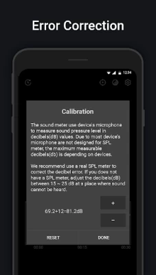 The value of decibel meter or sound meter(dB meter) is not as precise as an actual Sound Pressure Level Meter(SPL Meter), soundmeter, decibel meter or noise level meter, this is due to most device's microphone are aligned to human voice. To fix this, use an actual sound meter or sound pressure level meter (SPL meter) to adjust decibels error as close as possible before use. If you didn't own an actual Sound Pressure Level Meter (SPL meter), go to a very quiet place where sound cannot hear and adjust the reading value to 20~30dB.