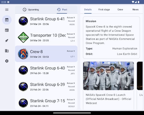 View all past and planned missions from SpaceX with extensive launch details.