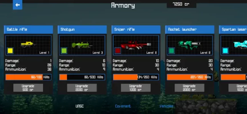 Collect and upgrade a variety of powerful weapons going from the Magnum to the Spartan Laser, level them up with your kills and collect unique skins for each weapon.