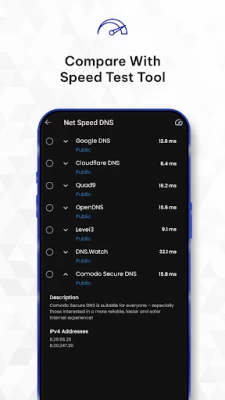Simple and intuitive design for quick DNS optimizations. Real-time feedback on speed test results.