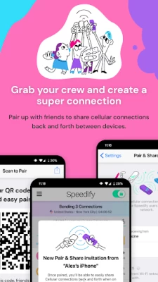 With Pair & Share you can easily share cellular connections between multiple Speedify users on the same Wi-Fi network. That means more stable connections on the road, at conferences and concerts, or while livestreaming. Grab your crew and create a super connection!