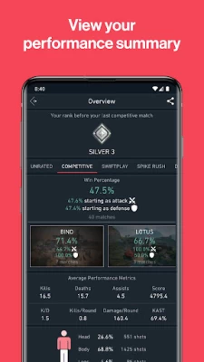 Spike Stats creates a summary of players’ progress from their recent matches. This summary includes an overall win rate per game mode, win rate per map, win rate when the user starts the match as an attacker or defender, average performance metrics such as KDA, KAST and shot percentages.