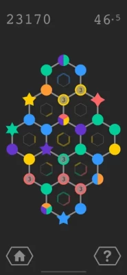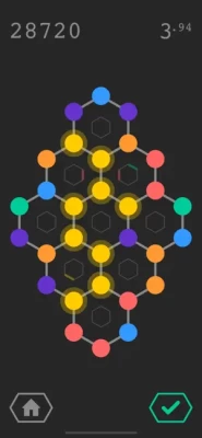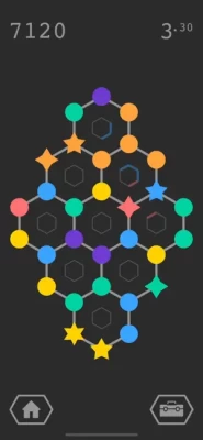 Full Hexagons: When a hexagon's sides are all the same color, a Full Hexagon is created and the entire board is cleared.