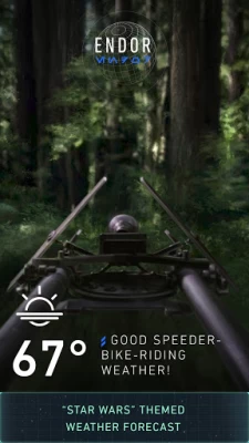 Get Star Wars-themed weather and five-day forecasts, featuring in-universe planets and locales